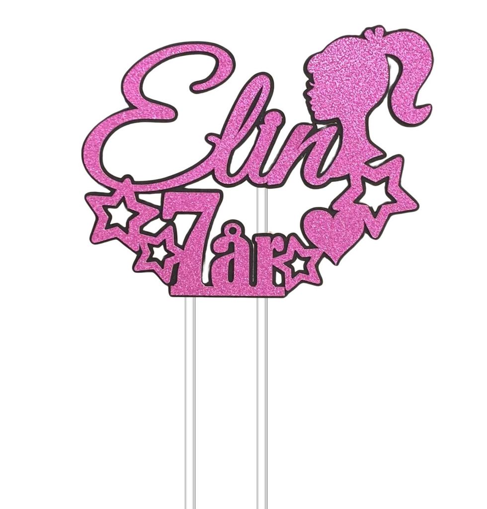 Handgjord personlig caketopper med ett valfritt namn samt år. Välj mellan tolv olika Glittriga färger och anpassa med vit eller svart bakgrundskontur. Kommer på två transparenta akrylpinnar för enkel montering på din tårta.