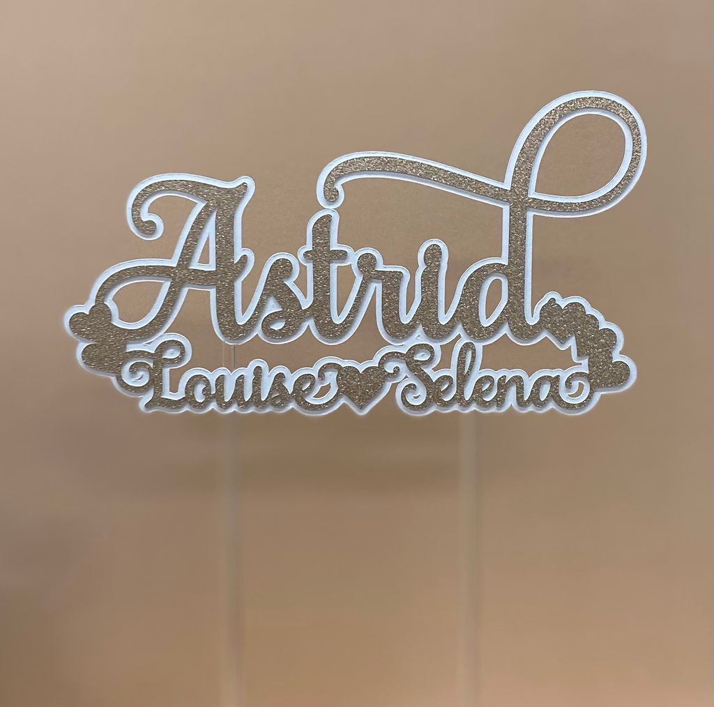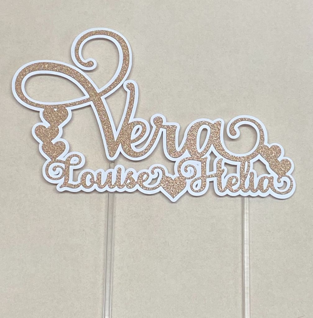 Handgjord personlig caketopper med tre valfria namn. Välj mellan tolv olika färger samt vit eller svart bakgrundskontur. Kommer på två transparenta akrylpinnar för enkel montering i din tårta.