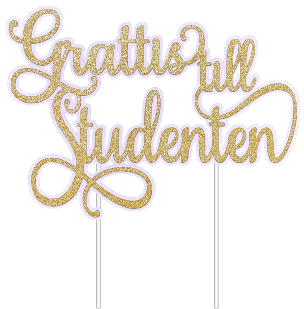 Handgjord caketopper med texten Grattis till Studenten. Välj mellan fyra olika färger samt vit eller svart bakgrundskontur. Kommer på två transparenta akrylpinnar för enkel montering i din tårta.