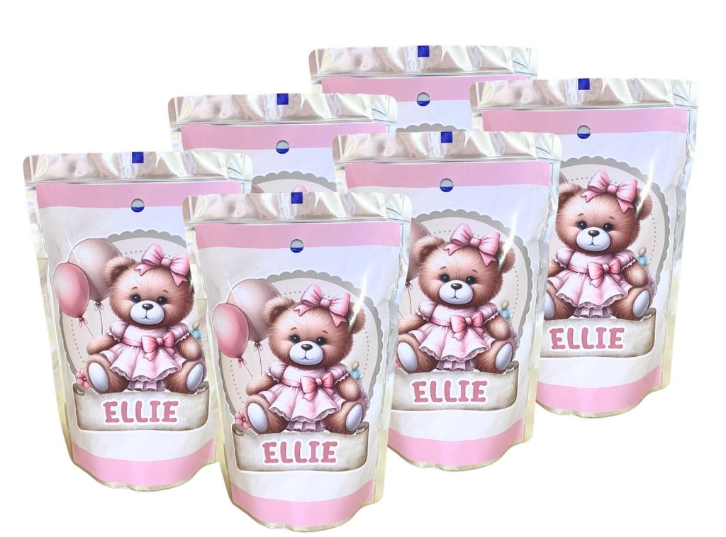 Beskrivning av Etiketter Nalle rosa Namn 12 stycken självhäftande etiketter med ett valfritt namn att sätta på sugrörsdricka som t.ex Capri-Sun.