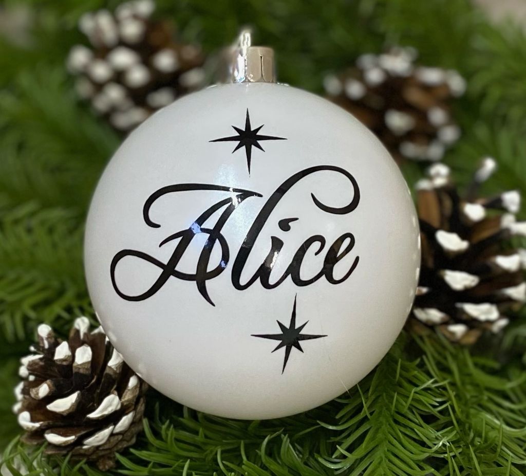 Personlig julgranskula med ett valfritt namn och två stjärnor. Kulan är gjord av plast och är 8 cm i diameter. Välj mellan olika färger på din text och kula.