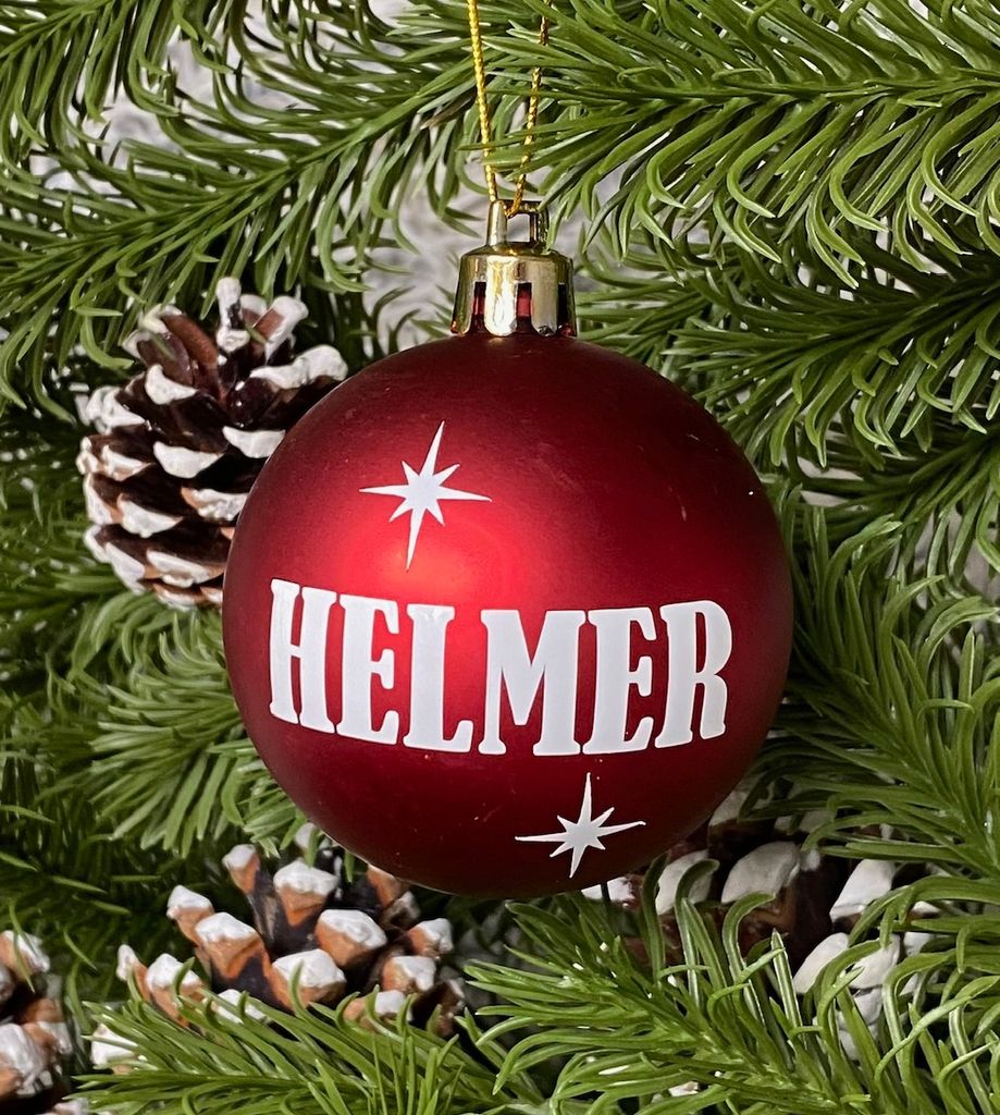 Personlig julgranskula med ett valfritt namn och två stjärnor. Kulan är gjord av plast och är 6 cm i diameter. Välj mellan olika färger på din text och kula.