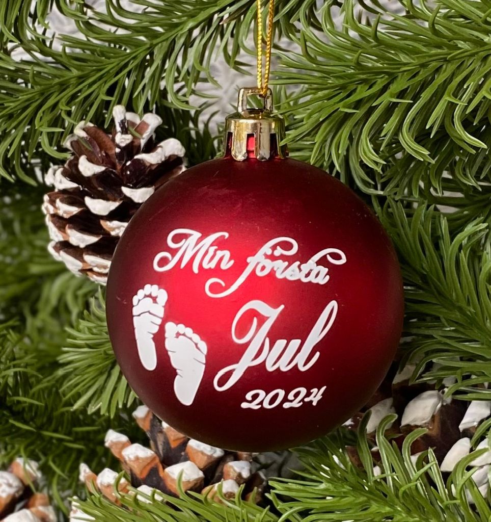 Julgranskula med texten min första jul 2024 och två små söta fötter. Kulan är gjord av plast och är 6 cm i diameter. Välj mellan olika färger på din text och kula.
